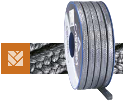 INCOBRAID®. Empaquetadura especial de fibra de granito PAN con fibra larga, reforzada con filamentos metálicos discontinuos con dimensiones micrométricas. La impregnación especial se realiza en tres fases: en cada hilo, durante el trenzado y en la estructura de la empaquetadura. La mezcla es enriquecida con inhibidor de corrosión inorgánico.